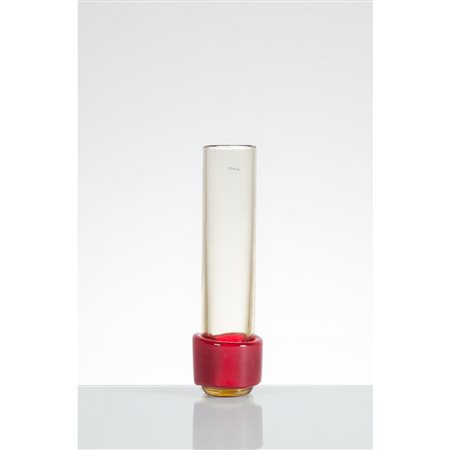 Vaso solifleur della serie “Cinti” in vetro pagliesco, corpo cilindrico cinto in basso da una fascia di vetro rosso, bocca circolare piana. Etichetta di produzione e firma alla base “Venini Italia 2003”.