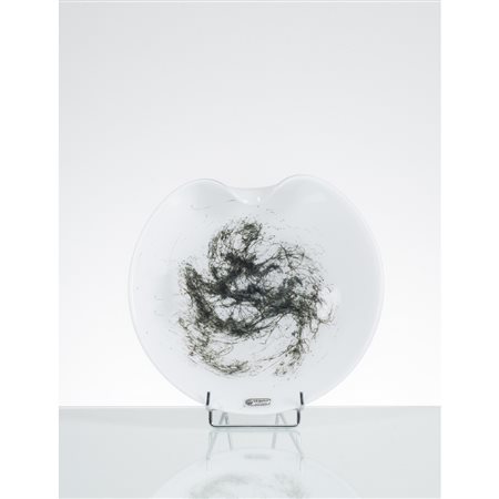 Svuota tasche in vetro lattimo decorato con filamenti neri, corpo circolare con bordo su di un lato ondulato. Etichetta di produzione.