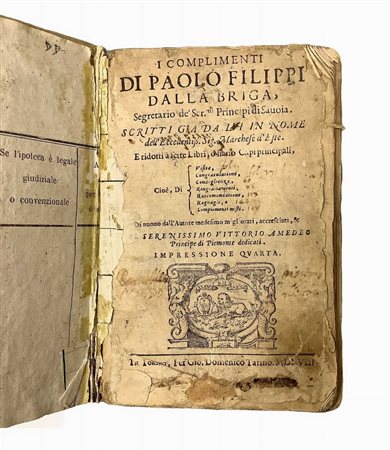 Opera del segretario dei Principi di Savoia, realizzata in nome del Marchese d'Este. Torino, Per Gio. Domenico Tarino. Coeva pergamena morbida, titolo cesellato sul lembo di coda, Epistola dedicatoria generale dell'autore a Vittorio Amedeo, principe di Piemonte datato da Briga [Alta], 15 dicembre 1607. Paolo Filippi dalla Briga, poeta e segretario alla corte dei Duchi di Savoia a Torino, si occupa dell'arte di scrivere lettere e di scegliere i "complimenti". Insiste sul fatto che le formule usate nelle lettere devono adattarsi alle circostanze. Questo repertorio ebbe un grande successo; l'opera, pubblicata per la prima volta nel 1601, conobbe diverse edizioni, di cui una postuma (1619).
