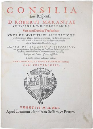 Lot 5 Roberto Maranta (Venosa 1476-Napoli 1535) - Consilia sive responsa, 1591 Una cum Duobus Tactatibus: unus de multiplici alienatione. Cum summariis, et indice locuplentissimo cum privilegis. Venetiis, apud Ioannem Baptistam Sessam, & Fratres. Presenti sfilacciature e fioritureUna cum Duobus Tactatibus: unus de multiplici alienatione. Cum summariis, et indice locuplentissimo cum privilegis. Venetiis, apud Ioannem Baptistam Sessam, & Fratres. Presenti sfilacciature e fioriture