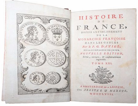 Lot 23 Gabriel Daniel (1649-1728) - Histoire de France, 1758 Depuis l'etablissement de la monarchie francoise dans les gaules. Tomi XIX e XXI in due volumi, Amsterdam e Lipsia. Arkste' e Merkus. Opera incompleta, presenti fioritureDepuis l'etablissement de la monarchie francoise dans les gaules. Tomi XIX e XXI in due volumi, Amsterdam e Lipsia. Arkste' e Merkus. Opera incompleta, presenti fioriture