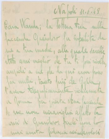 Testo su due facciate, ad inchiostro verde tipico di Graziani, datata Napoli 11.6.48 , ed indirizzata alla figlia Wanda, circa alcune faccende di carattere economico/familiare. Firmata "... ti bacio e benedico - Tuo Padre"