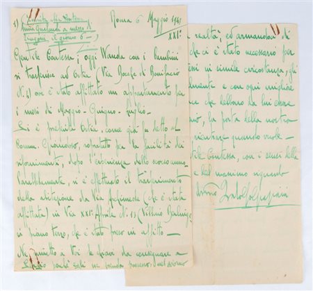 Testo su quattro facciate, ad inchiostro verde tipico di Graziani, datata Roma 6 maggio 1943 / XXI° , ed indirizzata alla Contessa Anna Gualandi, circa alcune faccende di carattere familiare sui traslochi da un appartamento all'altro, in Roma ed Ostia, immobili di proprietà della Contessa.
