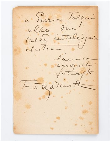 Lot 10 Dedica autografa e firma originale ad inchiostro nero di Filippo Tommaso Marinetti, su pagina di libro (misure cm. 18x12). La dedica recita "A EnricoFalqui - Alla sua calda intelligenza elastica - l'amico aeropoeta futurista - F.T.Marinetti" - in buone condizioni
