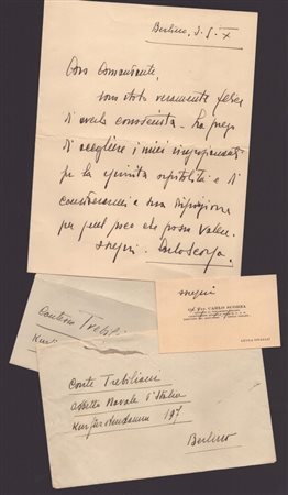 Lot 11 Lettera di Carlo Scorza, segretario del Partito Nazionale Fascista, scritta sulla prima facciata di foglio a 4 facciate, dal testo " Berlino 3.5.X - Caro Comandante, sono stato veramente felice di averla conosciuta. La prego di accogliere i miei ringraziamenti per la ospitalità e di considerarmi a sua disposizione per quel poco che possa valere. Ossequi. Carlo Scorza" - Lettera scritta ad inchiostro nero, autografo con firma originale di Carlo Scorza, in busta originale, indirizzata al Conte Trebiliani Addetto Navale d'Italia a Berlino. In aggiunta biglietto da visita di Carlo Scorza, come Luogotenente Generale della Milizia Volontaria Sicurezza Nazionale, in busta, indirizzata alla Contessa Trebiliani. Perfette condizioni