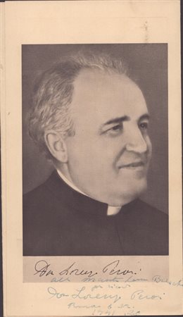 Insieme una cartolina con ritratto fotografico del presbitero in età giovanile, con dedica e firma non meglio identificata "I miei saluti in compagnia al genio di musica paradisiaca - A.N."