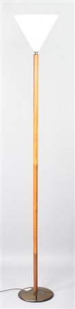 lampada da terra con struttura in legno di pero e base in metallo, parte superiore in vetro satin
