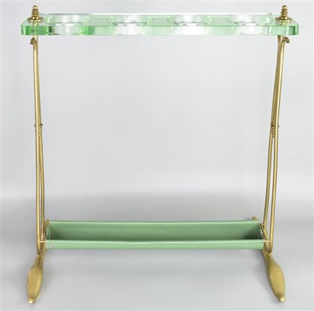 ripiano in cristallo, struttura in ottone con vaschetta in materiale plastico