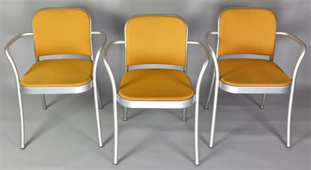 lotto di tre sedie con struttura in alluminio e materiali plastici e seduta imbottita