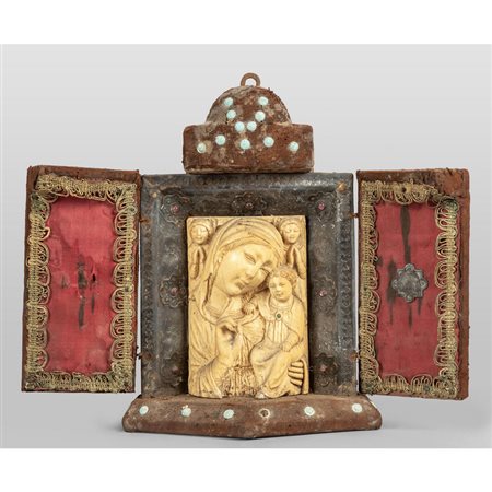 Lot 0001 Altarolo da viaggio con altorilievo in avorio raffigurante Madonna con Bambino e angioletti cornice in argento con pietre semipreziose Russia cm.12xh.17
