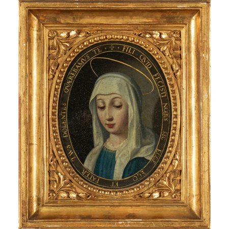 Lot 0017 Acquasantiera Luigi XIV in legno finemente intagliato a volute e dorato all'interno dipinto raffigurante l'Immacolata Piemonte I metà sec.XVIII