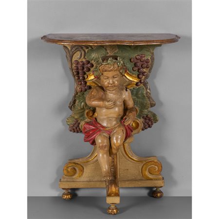 Lot 0004 Consolina in legno intagliato laccato e dorato raffigurante un putto piano sagomato sec. XIX