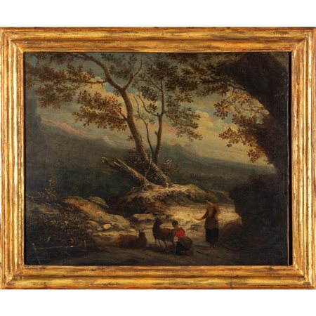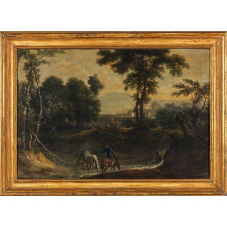 Lot 0007 Scuola romana sec.XVIII 'Paesaggio animato da cavalieri alla fonte' olio cornice coeva in legno dorato