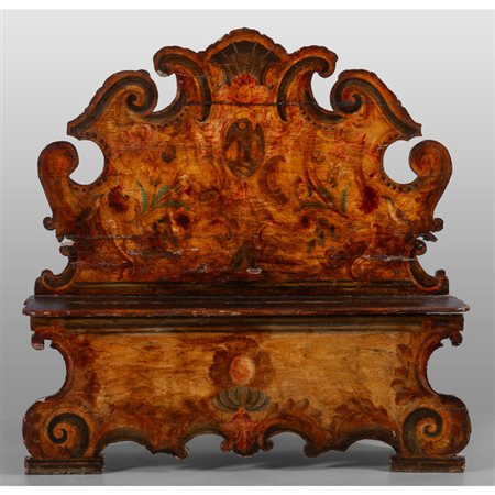 Lot 0008 Panca da ingresso con schienale sagomato dipinto in policromia con stemma centrale e fiori