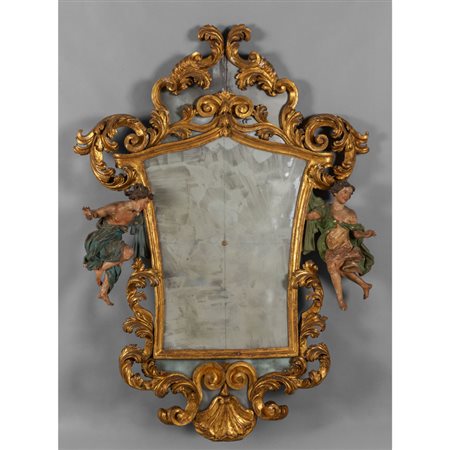 Lot 0019 Grande specchiera barocca Luigi XIV in legno intagliato e dorato ai lati coppia di figure laccate in policromia Italia Centrale sec.XVIII