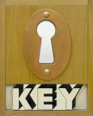 Lot 12 Joe Tilson, Key Box, 2003, cm 33x41, Assemblaggio di legno dipinto, Esemplare 4 di 40, Pubblicazione su 'Joe Tilson. Multipli 1964-2011', Confezione originale, Fimra - Titolo - Tiratura su scatola e cartiglio interno