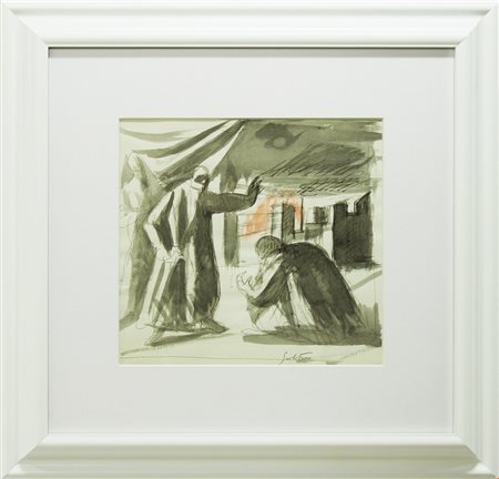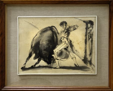 Lot 15 Aligi Sassu, Redondo, 1967, Tecnica mista su carta applicata su tela, 28x40 cm, Provenienza Casa d'Arte La Gradiva, Firma al recto, Titolo e Anno al verso, Timbro al verso Casa d'Arte La Gradiva, Cornice in omaggio