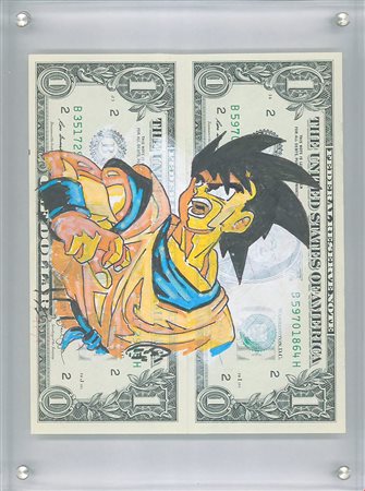 Lot 4 Money1st, Dragon Ball, 2024, Acrilico su dollaro in teca di plexiglass, 15x20 cm, Autentica a cura dell'artista, Firma e Titolo al verso