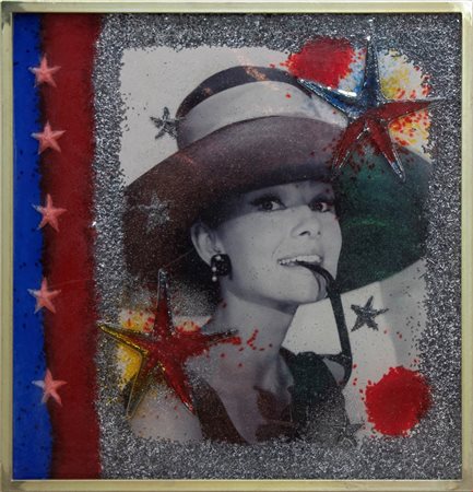 Lot 7 Omar Ronda, Audrey Frozen, 2010, Tecnica mista su tavola, 70x70 cm, Archiviazione presso Archivio Ronda, Pubblicazione su Catalogo Hollywood, Firma Titolo e Datazione al verso, Numero Archivio al verso, Cornice originale in omaggio