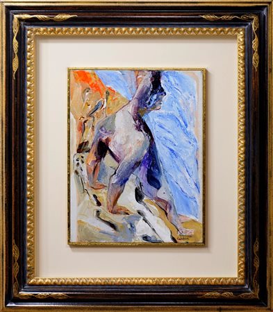 Lot 18 Ennio Calabria, Studio per uomo sullo scoglio, 2006, Acrilico su tela, 42x32 cm, Autentica a cura dell'artista, Archiviazione presso Archivio Calabria, Firma al recto, Dichiarazione autenticità firmata al verso, Titolo al verso, Cornice in omaggio