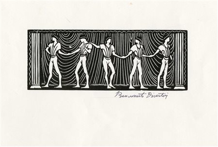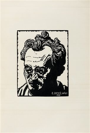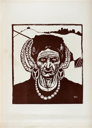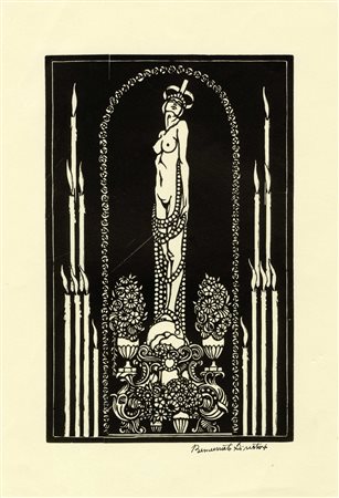 Xilografia. mm 178x150. Foglio: mm 302x240. Firmata nella matrice in alto a destra. Rara prova di stampa in nero di una xilografia pubblicata nel fascicolo dei secessionisti de L'Eroica nel 1915 (impressa in rosso) e ne La via lattea nel 1914. Pur essendo comunemente descritta come xilografia, potrebbe in realtà trattarsi di una zincografia adatta al formato della rivista, essendo la versione ridotta di una introvabile xilografia di dimensioni più grandi, di cui l'unica copia a noi nota è conservata presso l'archivio del museo Casorati a Pavarolo. (1) Un leggerissimo ingiallimento da esposizione e qualche trascurabile macchiolina ma buona conservazione generale. -