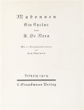1) Mayrink G., Der Golem. Con 8 illustrazioni litografiche di Steiner-Prag H., Lipsia, 1915. Nota manoscritta ad inchiostro di china bruno alla prima carta bianca. In riccamente decorata legatura con titoli impressi ai piatti e al dorso. 2) De Rora U., Madonnen Ein Cyklus. Con 10 meravigliose illustrazioni all'acquaforte di Schwimbeck F., Lipsia, 1919. Titoli impressi in oro al dorso. SI AGGIUNGE: Autori Vari, Die Graphischen Künste. 1918. Cartella con testi e incisioni di autori vari con dedica manoscritta al piatto anteriore. (3) Minimi difetti, altrimenti ottima conservazione generale. -