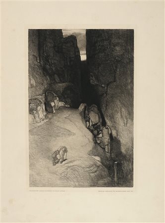 Acquaforte su carta vergellata. mm 200x150. Foglio: mm 385x294. Edizione probabilmente collocabile nella seconda ristampa di 65 copie poichè mancante della velina applicata (tipica dei primi 150 esemplari) ma comprensiva dell'iscrizione "proof" in lastra in basso a sinistra (rimossa nelle ultime 100 copie in carta Giappone). Tavola n. 3 di 22. (1) Brunitura da esposizione. Impressione lievemente scarica al margine inferiore. Buona conservazione generale. -