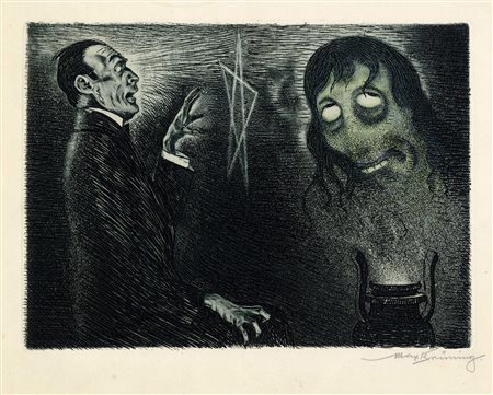1) Summoming. 1925 ca. Acquaforte e acquatinta. mm 235x320. Foglio: mm 367x470. Firmata a matita in basso a destra. Iscrizioni a matita in basso a sinistra. 2) Hauting. 1925 ca. Acquatinta su velina applicata. mm 350x195. Foglio: mm 500x345. Firmata a matita in basso a destra. (2) Margini con fioriture e gore sparse. Incisi in buono stato conservativo. -
