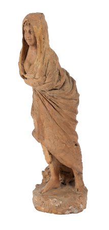 Terracotta. cm 42x14x12. Titolato e firmato sul piedistallo della figura. (1) Minimi difetti e piccole crepe dovute alla porosità del materiale. Buona conservazione complessiva. -