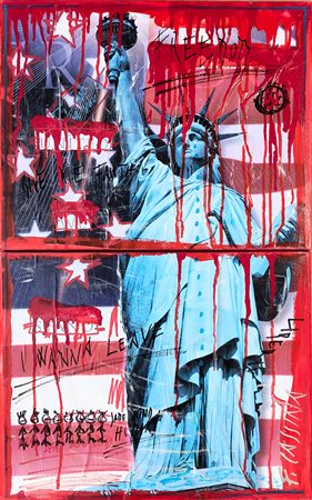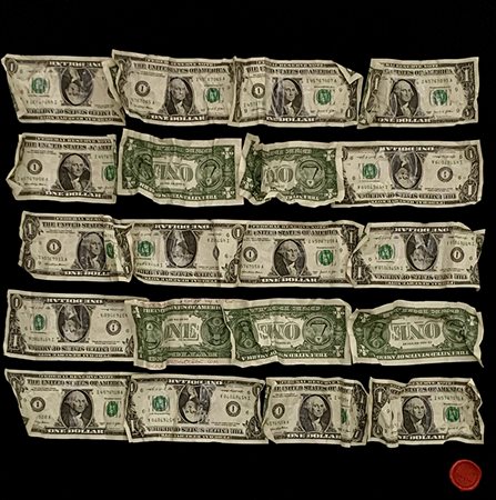 Tecnica mista colore acrilico black 4.0 su tela con applicazione di banconote america 1USD con scritte fotosensibili trasparenti blu