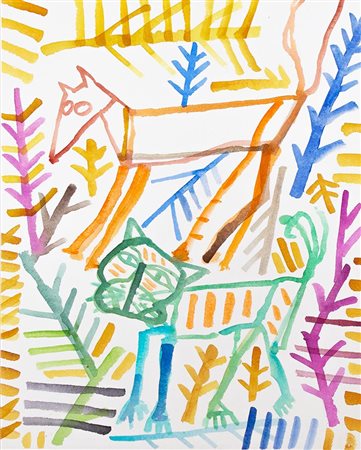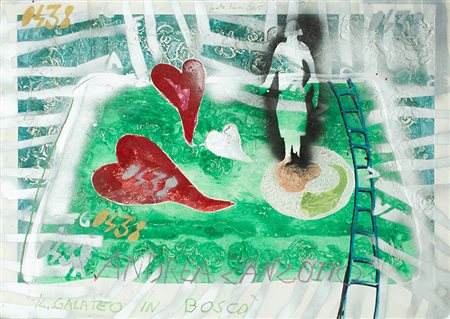 Lot 18 Giosetta Fioroni, Tecnica mista e smalto su cartoncino, 70 x100 cm, Il Galateo in bosco,2005; Firmato e datato in alto al centro; Autentica dell'artista su foto