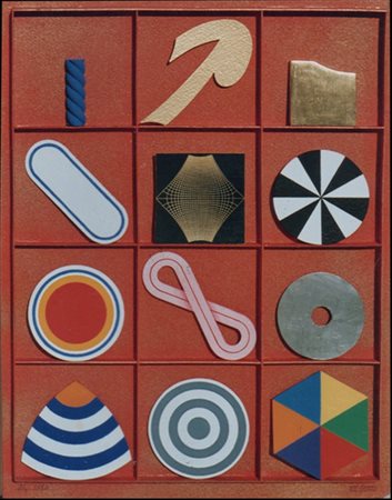 Lot 5 Lucio Del Pezzo, Acquarello e collage su tavola, 38x29 cm, Elementi su fondo rosso, 1986; Pubblicato; Autentica dell'artista su foto