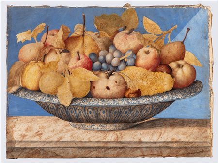 Lot 7 Octavianus Monfort (documentato in Piemonte tra il 1680 e il 1689) - Mele, pere, uva, castagne e altri frutti in un'alzata di ceramica bianca e blu su un piano di pietra