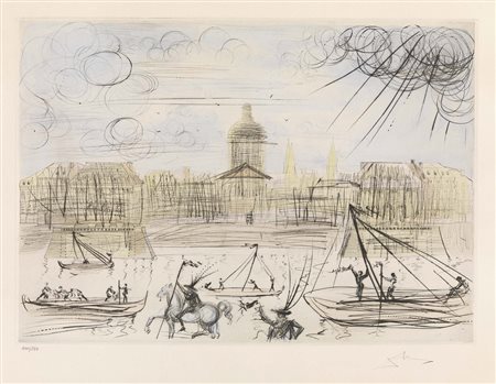 Lot 1 Salvador Dalí, Figueres 1904 - 1989, L'Académie de Paris, 1971, Acquaforte, es. 100/250, cm. 42,5x59,5 (lastra), cm. 59,8x75,7 (carta), Firma a matita sul margine in basso a destra: Dalí, tiratura in basso a sinistra: 100/250., Tiratura di 250 esemplari in numeri arabi, 150 in numeri romani, 350 in nero in numeri arabi, 100 in seppia su carta giapponese, 125 colorati a mano e un indefinito numero di prove; stampatore Atelier 20th Century, editore Amiel., Bibliografia: Salvador Dalí. Catalogue Raisonné of Etchings and Mixed-Media Prints. 1924 - 1980, Edizioni Prestel, 1994, p. 200, n. 514.,