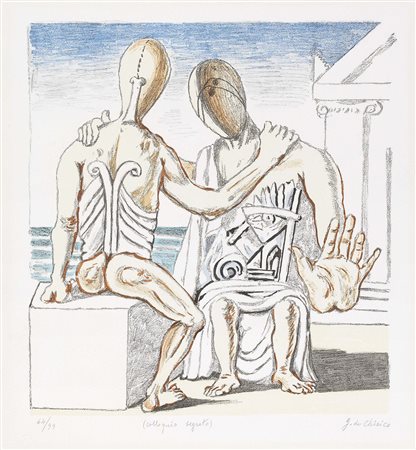 Lot 2 Giorgio de Chirico, Volos 1888 - Roma 1978, Colloquio segreto, 1969, Litografia a colori, es. 64/99, cm 69x59 (carta), Firma a matita sul margine in basso a destra: G. de Chirico, titolo al centro: (Colloquio segreto), tiratura in basso a sinistra: 64/99, timbro a secco G. de Chirico: timbro a secco Alberto Caprini stampatore in Roma., Tiratura di 99 esemplari in numeri arabi, XV in numeri romani, 12 prove d'artista e 15 prove d'artista su carta Japon., Bibliografia: Edoardo Brandani, Giorgio de Chirico. Catalogo dell'opera grafica 1969-1977, Edizioni Bora, Bologna, 1990, p. 67, n. 50.,