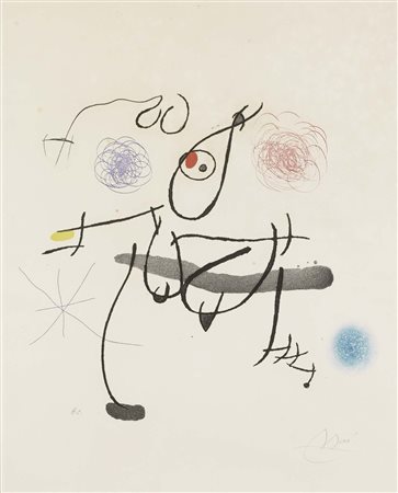 Lot 3 Joan Miró, Barcellona 1893 - Palma di Maiorca 1983, Miró à l'encre, 1972, Acquaforte e acquatinta a colori, es. H.C., cm. 65,5x50 (carta), Firma a matita sul margine in basso a destra: Miró, tiratura in basso a sinistra: H.C., Realizzata per il libro Miró à l'encre; tiratura di 70 esemplari numerati e firmati e alcuni esemplari firmati fuori commercio; editore XX siècle, Parigi, stampatore Morsang, Parigi., Bibliografia: Jacques Dupin, Miró graveur II. 1961-1973, Daniel Lelong Editeur, Paris, 1989, p. 204, n. 564.,