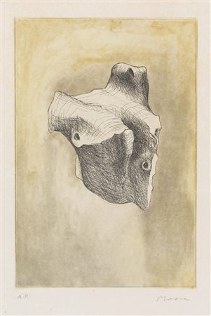 Lot 4 Henry Moore, Castleford 1898 - Much Hadham 1986, Stone IV, 1977, Acquaforte e acquatinta, es. A.P., cm. 29,2x19,7 (lastra), cm. 50,3x35,7 (carta), Firma a matita sul margine in basso a destra: Moore, tiratura in basso a sinistra: A.P., Bibliografia: Patrick Cramer, Alistair Grant, David Mitchinson, Henry Moore, catalogue of graphic work, volume III 1976-1979, Patrick Cramer, Ginevra, 1980, n. 464.,