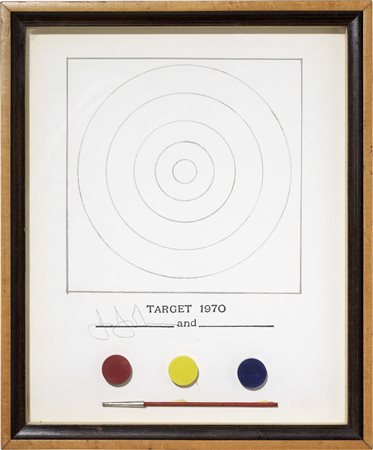 Lot 5 Jasper Johns, Augusta 1930, Target, 1971, Litografia con collage e timbro in cornice in legno, multiplo, cm. 28,5x24, Firma al centro: J. Johns., Tiratura di 50 esemplari più 6 prove d'artista, un Ready to Print, una prova dello stampatore, 3 esemplari non destinati alla vendita (GEL). Stampatore Kenneth Tyler., L'opera è accompagnata dal volume Technics and Creativity, in custodia originale., Bibliografia: Technics and Creativity. Gemini GEL, The Museum of Modern Art, New York, 1971, n. 276 (JJ71-373).,