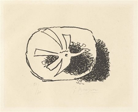 Lot 9 Georges Braque, Argenteuil 1882 - Parigi 1963, Août, 1958, Acquaforte, es. 50/70, cm. 33,7x47,5 (carta), Firma a matita sul margine in basso a destra: Braque, tiratura in basso a sinistra: 50/70, timbro a secco Libreria / Prandi / Reggio / E., Da una serie di sei acqueforti, tiratura di 70 esemplari su carta Auvregne, 10 serie di bozze numerate da I a X, Editore Louis Broder, Parigi, stampatore Crommelynck e Dutrou, Parigi., Bibliografia: Georges Braque. L'opera grafica, Il Saggiatore, Milano, 1962, pp. 82, 83, n. XXIV;, Dora Vallier, Braque. L'oeuvre gravé, catalogue raisonné, Flammarion, 1982, pp. 191, 192, n. 23.,