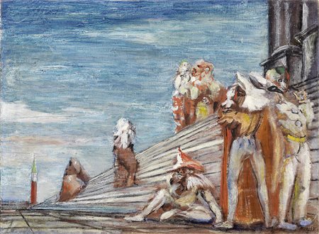 Lot 505 Aligi Sassu, Milano 1912 - Pollença 2000, Maschere, Olio su tela, cm. 54,5x74,5, Firma in basso a destra: Sassu. Al verso sulla tela: etichetta La Colonna Galleria d'Arte / Milano / Mostra Personale / dal 21/4 al 10/5/52. Storia, Collezione Guido Falck, Milano