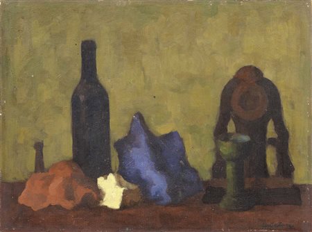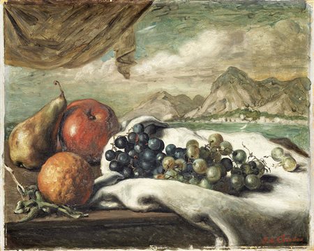 Lot 514 Giorgio de Chirico, Volos 1888 - Roma 1978, Vita silente, (fine anni Quaranta), Olio su carta applicata su cartone, cm. 40,5x50,7 Firma in basso a destra: G. de Chirico. Storia, Collezione Guido Falck, Milano Opera in fase di archiviazione presso la Fondazione Giorgio e Isa de Chirico, Roma.