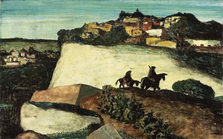 Lot 508 Salvatore Fiume, Comiso (Rg) 1915 - Milano 1997, Paesaggio con figure a cavallo, Olio su faesite, cm. 49,5x79,5 Firma in basso a destra: Fiume. Al verso, su una tavola di supporto: etichetta parzialmente abrasa con timbro Galleria Schettini, Milano. Storia, Collezione Guido Falck, Milano