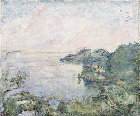Lot 512 Arturo Tosi, Busto Arsizio (Va) 1871 - Milano 1956, Lago d'Iseo, Olio su tela, cm. 50x60 Firma in basso a destra: A. Tosi. Al verso sulla tela e sul telaio: due timbri Galleria Bergamini / Milano; sul telaio: timbro Brera Galleria d'Arte, Milano. Storia, Collezione Guido Falck, Milano