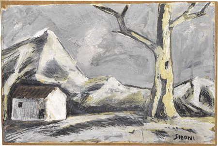 Lot 513 Mario Sironi, Sassari 1885 - Milano 1961, Paesaggio con albero e casa, Tempera e carboncino su carta applicata su faesite, cm. 29,8x45,5 Firma in basso a destra: Sironi. Storia, Collezione Guido Falck, Milano