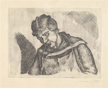 Lot 515 Giorgio Morandi, Bologna 1890 - 1964, Figura femminile dormiente, 1926, Acquaforte su rame, cm. 13,8x18,2 (lastra), cm. 22,8x30,2 (carta) Firma e data a matita sul margine in basso a destra: G. Morandi 1926. Al verso, su un cartone di supporto: etichetta Galleria d'Arte Maggiore, Bologna: etichetta Galleria Marescalchi, Bologna. Terzo stato su tre, tiratura di pochissimi esemplari non numerati. Bibliografia, Lamberto Vitali, L'opera grafica di Giorgio Morandi, Giulio Einaudi Editore, Torino, 1964, n. 29;, Michele Cordaro, Morandi incisioni. Catalogo Generale, Edizioni Electa, Milano, 1991, p. 29, n. 1925 1. Restauri ai margini.