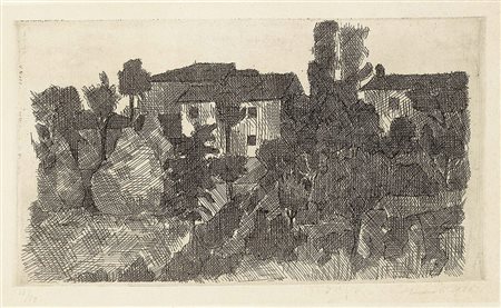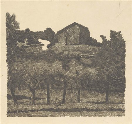 Lot 524 Giorgio Morandi, Bologna 1890 - 1964, Paesaggio di Grizzana, le Lame, 1931, Acquaforte su rame, cm. 23,6x24,8 (lastra), cm. 24,6x26,5 (carta) Timbro a secco in basso a sinistra: Finarte, Eredità Morandi 1996. Primo stato su tre, tiratura di tre esemplari. Bibliografia, Lamberto Vitali, L'opera grafica di Giorgio Morandi, Giulio Einaudi Editore, Torino, 1964, n. 89;, Michele Cordaro, Morandi incisioni. Catalogo Generale, Edizioni Electa, Milano, 1991, p. 100, n. 1931 8.