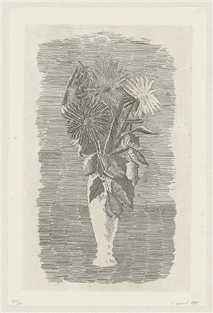 Lot 517 Giorgio Morandi, Bologna 1890 - 1964, Fiori in un vasetto bianco, 1928, Acquaforte su zinco, es. 25/30, cm. 24,6x16,3 (lastra), cm. 44,8x34 (carta) Data in lastra a destra verso il basso: 1928, firma e data a matita sul margine in basso a destra: Morandi 1928, tiratura in basso a sinistra: 25/30: timbro a secco Finarte Eredità Morandi 1996; al verso su un cartone di supporto: etichetta Mostra Internazionale di Bianco e Nero - Lugano. Secondo stato su tre; tiratura di 30 esemplari numerati. Bibliografia, Lamberto Vitali, L'opera grafica di Giorgio Morandi, Giulio Einaudi Editore, Torino, 1964, n. 51;, Michele Cordaro, Morandi incisioni. Catalogo Generale, Edizioni Electa, Milano, 1991, p. 58, n. 1928 11.