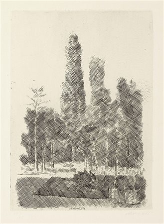 Lot 518 Giorgio Morandi, Bologna 1890 - 1964, I pioppi, 1930, Acquaforte su rame, es. 55/65, cm. 25,8x18,3 (lastra), cm. 41x31,5 (carta) Firma e data in lastra in basso al centro: Morandi 930, firma a matita sul margine in basso a destra: Morandi, tiratura in basso a sinistra: 55/65. Primo stato su due, tiratura di 65 esemplari numerati e alcune prove. Bibliografia, Lamberto Vitali, L'opera grafica di Giorgio Morandi, Giulio Einaudi Editore, Torino, 1964, n. 76;, Michele Cordaro, Morandi incisioni. Catalogo Generale, Edizioni Electa, Milano, 1991, p. 87, n. 1930 9.