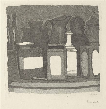 Lot 520 Giorgio Morandi, Bologna 1890 - 1964, Natura morta, 1933, Acquaforte su zinco, cm. 23,8x24,3 (lastra), cm. 30x38 (carta) Firma e data in lastra in basso a destra: Morandi 1933, scritta a matita sul margine in basso a destra: terzo stato, in basso a sinistra: timbro a secco Finarte, Eredità Morandi 1996. Terzo stato su quattro, tiratura di 3 esemplari. Bibliografia, Lamberto Vitali, L'opera grafica di Giorgio Morandi, Giulio Einaudi Editore, Torino, 1964, n. 100;, Michele Cordaro, Morandi incisioni. Catalogo Generale, Edizioni Electa, Milano, 1991, p. 114, n. 1933 2.