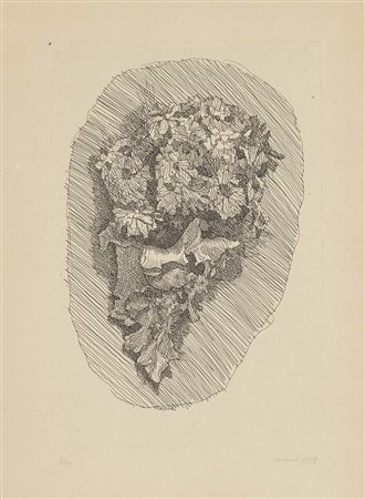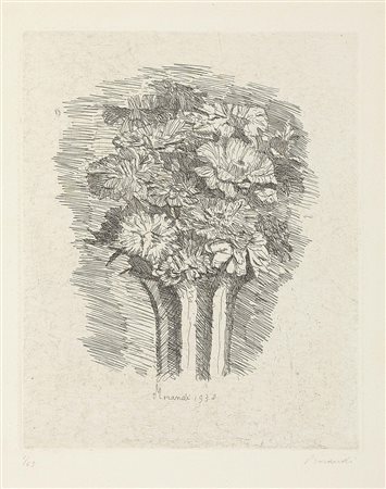 Lot 521 Giorgio Morandi, Bologna 1890 - 1964, Fiori in un cornetto su fondo ovoidale, 1929, Acquaforte su rame, es. 9/40, cm. 29,8x19,7 (lastra), cm. 47,9x32,7 (carta) Firma in lastra in basso al centro: Morandi, firma e data a matita sul margine in basso a destra: Morandi 1929, tiratura in basso a sinistra: 9/40. Primo stato su due; tiratura di 40 esemplari numerati e una prova di stampa. Bibliografia, Lamberto Vitali, L'opera grafica di Giorgio Morandi, Giulio Einaudi Editore, Torino, 1964, n. 63;, Michele Cordaro, Morandi incisioni. Catalogo Generale, Edizioni Electa, Milano, 1991, p. 71, n. 1929 11.